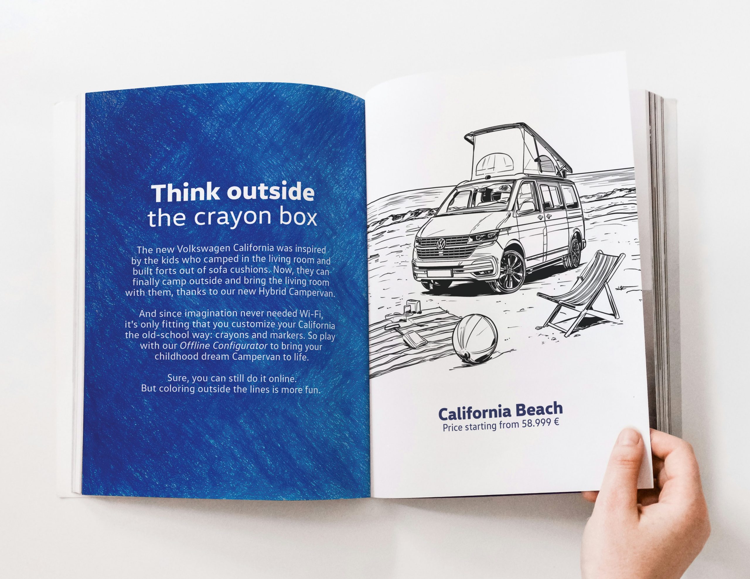 For International Children’s Day, we launched the Volkswagen Offline Configurator: a coloring book that lets people customize their own California. The book included blank campervan templates, wheel and headlight options, plus camping recipes, survival tips, and spooky campfire stories. On top of that, anyone who mailed us their customized campervan could win the chance to see it brought to life.
