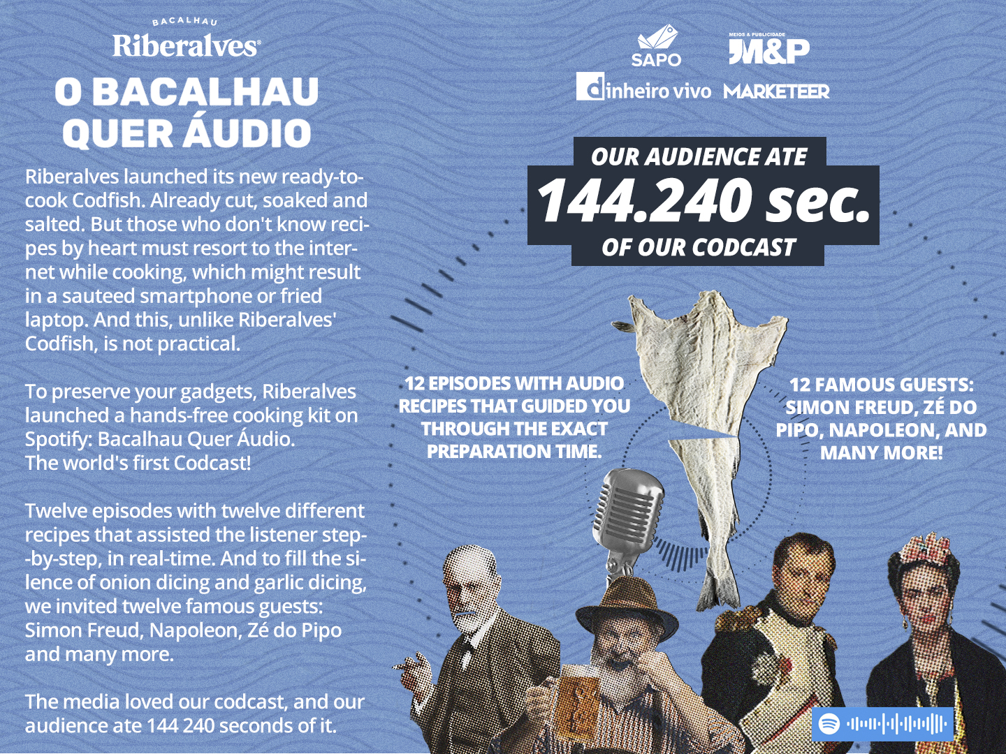 To preserve your gadgets, Riberalves launched a hands-free cooking kit on Spotify: Bacalhau Quer Áudio. The world's first Codcast! Twelve episodes with twelve different recipes that assisted the listener step-by-step, in real-time. And to fill the silence of onion slicing and garlic dicing, we invited twelve famous guests: Simon Freud, Napoleon, Zé do Pipo, and many more.